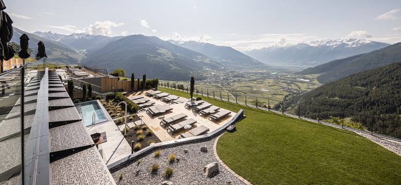 Ankommen, umschauen, staunen. Im Restaurant, im Zirben-Ruheraum oder in der Panoramic Sauna im Venosta Spa, in den Infinitypools und in allen Zimmern und Suiten – überall breitet sich ein unvergleichlicher Weitblick aus: von der Talsohle des Vinschgaus über die Ötztaler Alpen bis hin zur Ortlergruppe.